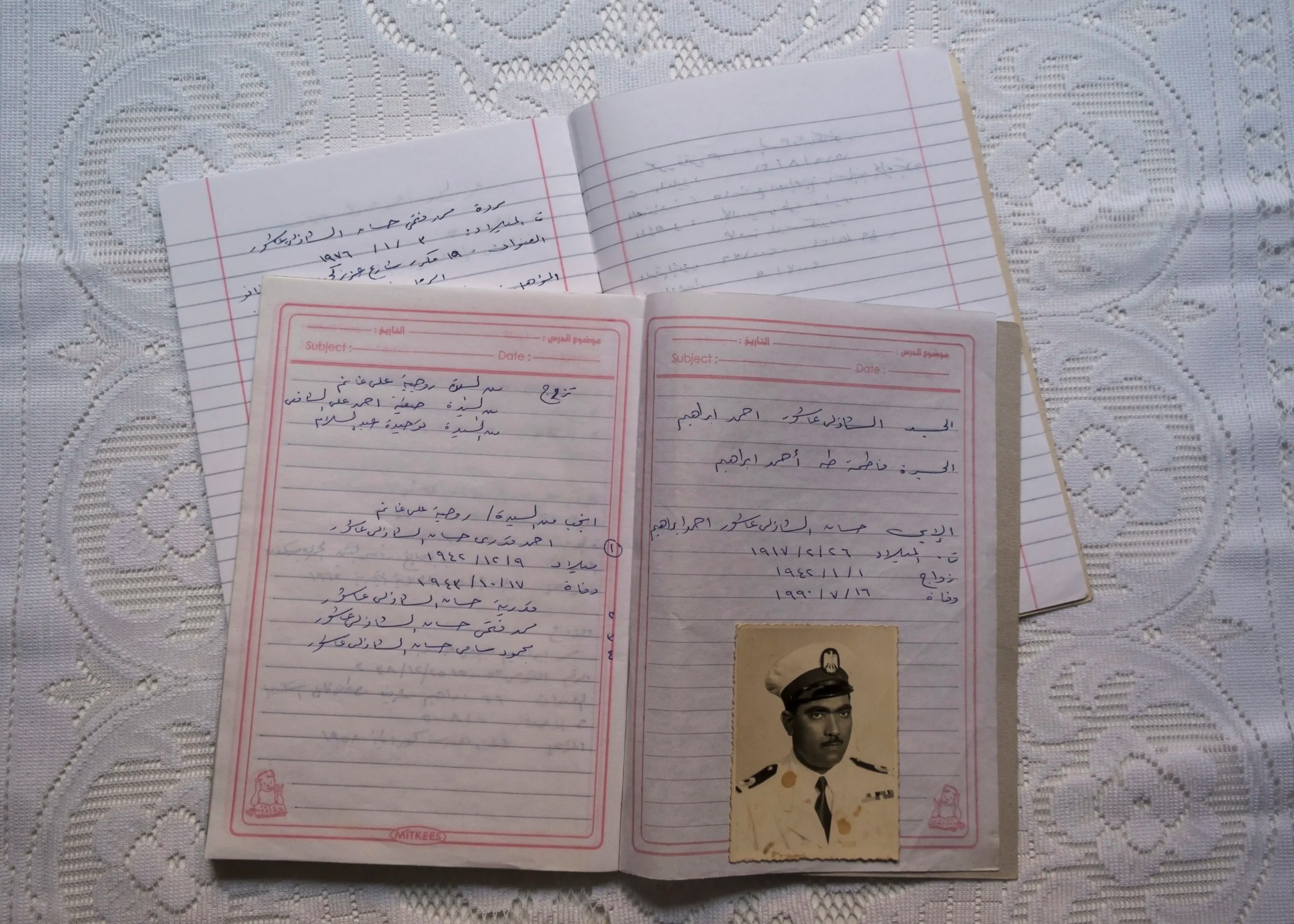 أعوام قليلة بعدها توفت عمتي الكبرى، كانت بمثابة أم ثانية لي، وأنفتح لي كنز من الصور التي كانت بحوزتها، حكايات عن أيام منسية من حياتها، صور عليها معلومات بخط إيدها وأخرى كنت أتمنى لو حكت لي الحكاية قبل أن ترحل، صور لجدي وجدتي في مراحل مختلفة من حياتهما لم أراها من قبل، من ضمن أوراقها وجدت كراسة شجرة العائلة. مثل عائلات مصرية كثيرة، نشأ مؤسس الأسرة في بلد، وبعده تفرق أولاده و أحفاده في المدن. عمتي كانت تحب أن تربطنا بالأعمام والأقارب عن طريق قصة شجرة العائلة، تحكي لنا من تزوج من، وكم أنجبوا، و من سافر، ومن زال على قيد الحياة، و من رحل. كانت تدون كل ذلك في كراسات.